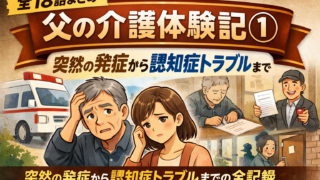 父が突然動けなくなり救急搬送された日から、認知症の診断、トラブルまでの介護体験を全18話でまとめました。家族として感じた不安や対応をリアルに記録。これから介護が始まる方にも参考になる内容です。
