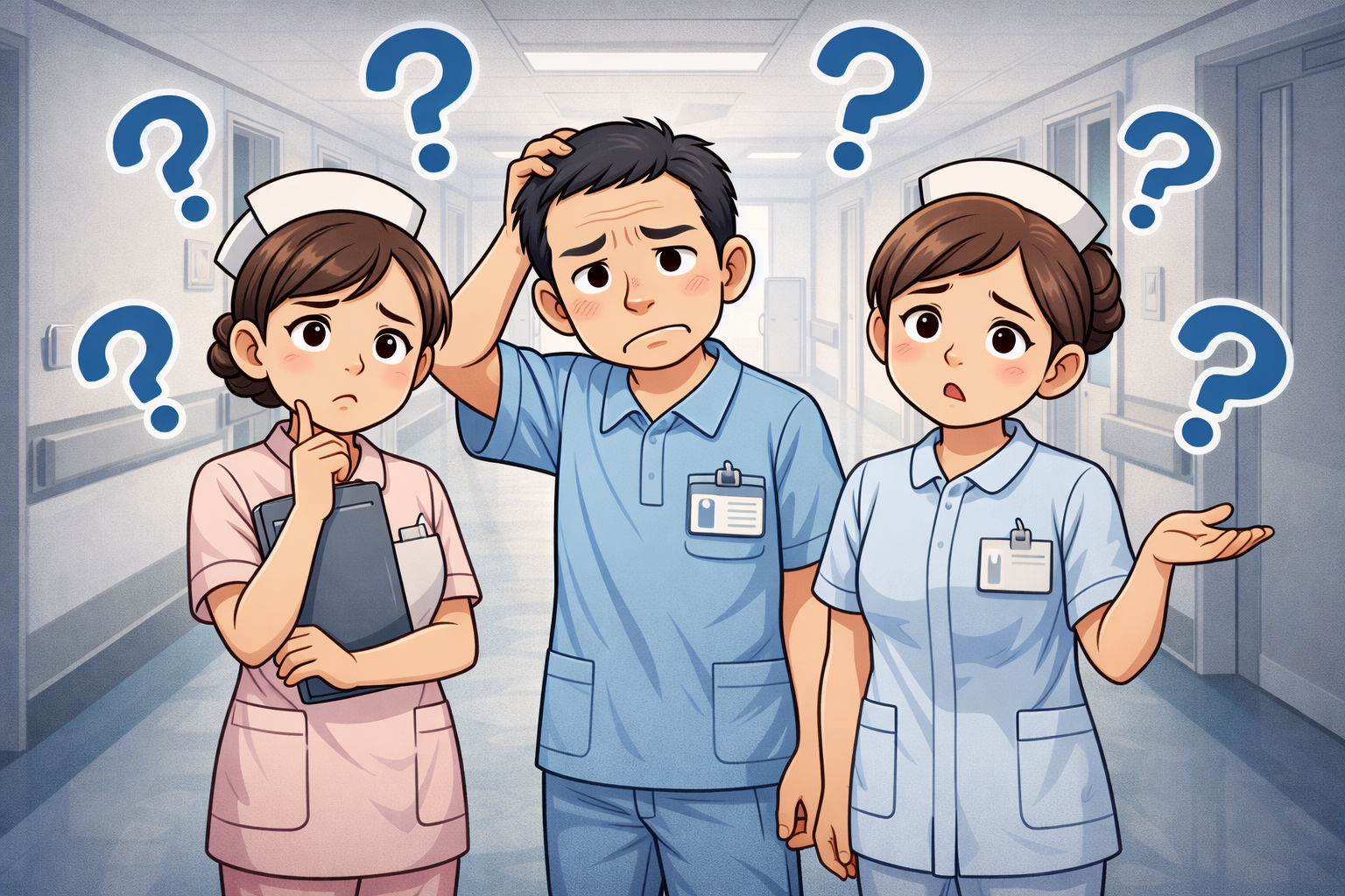 と言って看護師Bさんに聞きに行っていました。Bさんが説明してくれるのかと思いきや、今度はBさんが看護師Cさんに聞きに……