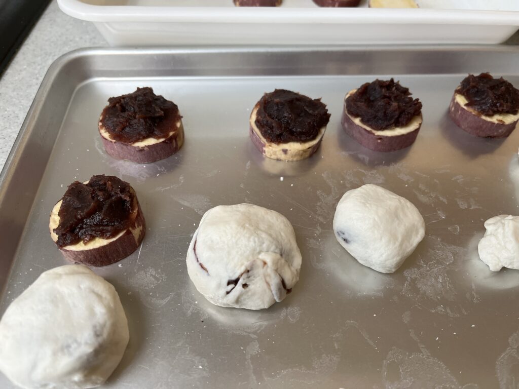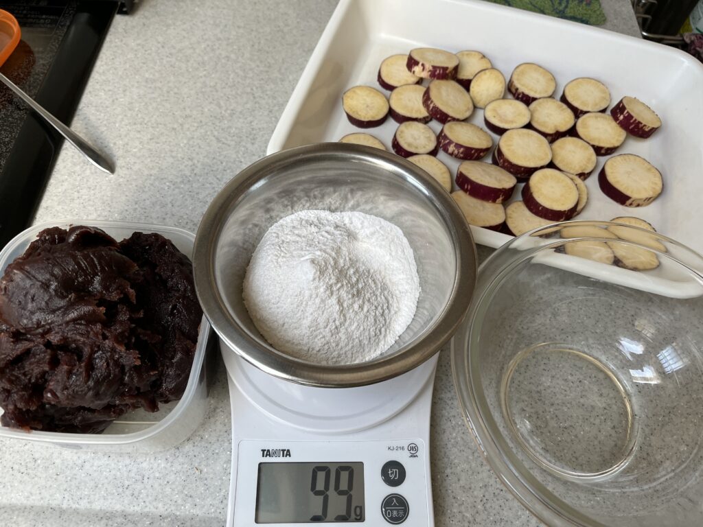 材料はサツマイモ、小麦粉、だんご粉、塩、あんこ、水だけあれば作れるのでカンタンではあります。でもすぐにできるかというと、蒸すのに20分くらいかかるので全行程1時間ほどかかりました。